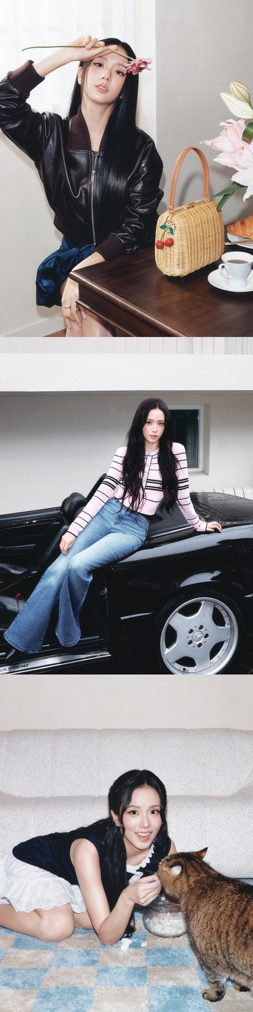 続く写真でジスは、ピンクのニットにデニムパンツを合わせ、メルセデス・ベンツのコンバーチブルに寄りかかり自由な感性を表現した。