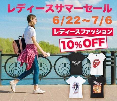新しい世界のエンターテイメント流通ネットワーク・サービスを展開する株式会社JAMSHOPPING(本社:東京都渋谷区 代表取締役:遠藤祐一)は、日本最大のRock&Entertainment 公式グッズ・ストア【PGS】( http://www.pgs.ne.jp )にて、2018年6月22日(金)から7月6日(金)まで、新作を含むレディースTシャツが全品10%OFFとなる『レディース・サマーセール!』を開催いたします。 これからの季節、フェスやレジャー、もちろんデイリーウェアとしても大活躍するTシ ャツ。今回、PGS では、セール期間中、新作を含む650以上にも及ぶレディースTシャツ全デザインを10%OFFでご用意いたします。人気商品は売り切れ必至!お気に入りのアー ティストのアイテムをゲットするまたとないチャンスです。