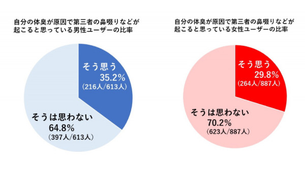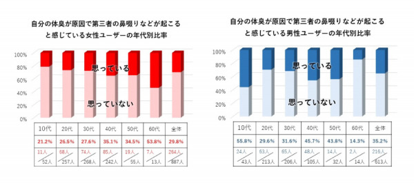 体臭検査を受検するユーザーは、基本的に自分自身の体臭に悩んでおり、その改善を目指しますが、検査ユーザー1500人のうち32%(男性216人、女性264人)は、友人や同僚や通りすがりの他人の身体的反応(鼻啜りや鼻水、鼻を押さえる、くしゃみや咳込み等)が気になると訴えています。