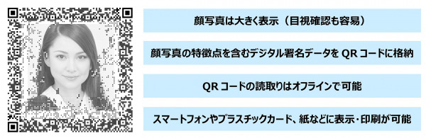 対面での本人確認時に、顔写真と本人の顔との確認が容易であるだけでなく、顔写真と格納したデジタル署名データを読み取りアプリで照合することにより、簡単で確実な本人認証を実現することができます。顔写真との照合による本人認証とあわせて、顔写真偽造を防ぐ、これまでにない特長をもつQRコードです。