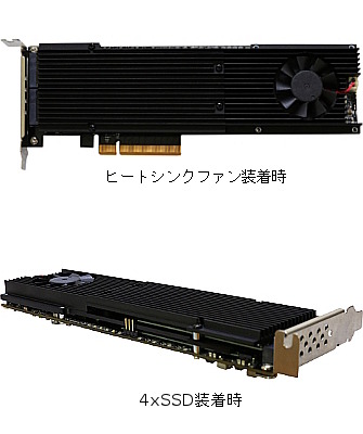 RAIDアダプターカード上には2段のM.2スロットが2スロット装備され、トータル4枚のM.2 NVMe SSDをサポートしています。各SSDは専用のファン付ヒートシンクと熱伝導シートにより効率よく冷却されます。