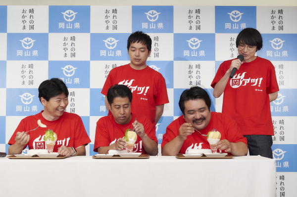 続いてステージには、本PRムービーの公開を記念して、とっとり・おかやま新橋館の2階「ビストロカフェももてなし家」で、7月20日より提供される「岡アツ!さんさんプレート」が登場。こちらのメニューは、津山のご当地グルメとしてBー1グランプリでシルバーに輝いたこともある「ホルモンうどん」や、肉食文化のまち津山の郷土料理で、骨の周りの肉をそぎ落とした「そずり肉」を使用する「そずり鍋」などメイン料理4品から選んだ1品に、岡山白桃とぶどうを使用したパフェや、前菜、岡山の地酒飲み比べセットがつき、さらに本イベントでも出演者の皆さんが着用した「岡アツ!Tシャツ」がセットになった特別メニューです。その中からマスカットと白桃のパフェを食べたウエストランド井口さんは、「めちゃくちゃ美味しいですね!今の暑い季節にピッタリですし、さすがくだもの王国ですね」コメントし、空気階段のもぐらさんは、「フルーツがジューシーでうますぎますね!これがこの安さで大丈夫ですか?」と驚きながらも、太陽がサンサンと降り注ぐ晴れの国にちなみ、3,333円に設定された本特別メニューを称賛しました。