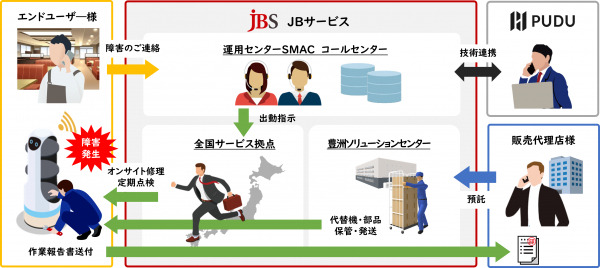 JBサービスは、24時間365日体制の運用センターをはじめ全国に43のサービス拠点を持ち、サービスロボットに限らず、商業施設やアミューズメント施設、オフィス、医療機関、物流倉庫、スーパー、飲食店など、様々な分野で利用される業務用機器の導入・運用・保守サービスをメーカーや販売代理店様に代わって提供しています。これらの実績とマルチベンダーに対応した技術力、全国規模のサービスネットワークが評価され、PUDUと認定保守パートナー契約の締結に至りました。