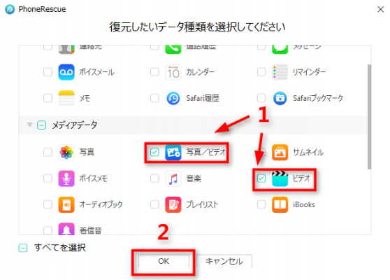 Step2.iPhone上のデータをスキャンします。「写真ビデオ」と「ビデオ」チェックボックスをオンにする必要があります。「OK」をクリックします。