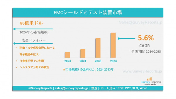 Surveyreportsの専門家は、EMCシールドとテスト機器市場調査を分析し、EMCシールドとテスト機器の市場規模が2024年に86億米ドルであることを発見した。さらに、EMCシールドとテスト機器市場シェアは、2033年末までに165億米ドルの感動的な収益を予見する。EMCシールドとテスト機器市場は、2024年と2033年の予測期間中に約5.6%のCAGRで成長することが提案されている。