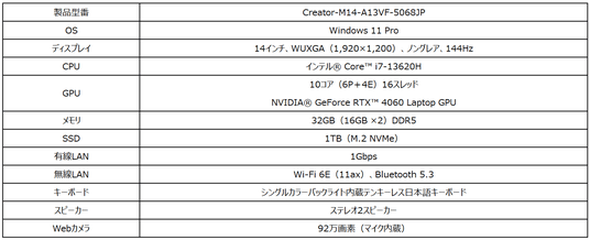 「Creator-M14-A13VF-5068JP」は、14インチサイズ・薄さ22.3mm・軽さ約1.6kgの本体に「インテル(R) Core(TM) i7-13620H」と「NVIDIA(R) GeForce RTX(TM) 4060 Laptop GPU」を搭載したクリエイターノートPCです。