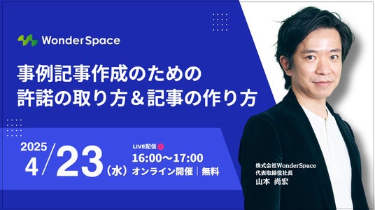 株式会社WonderSpace(本社:東京都港区、代表取締役社長:山本 尚宏)は『事例記事作成のための許諾の取り方&記事の作り方』をテーマにウェビナーを開催します。