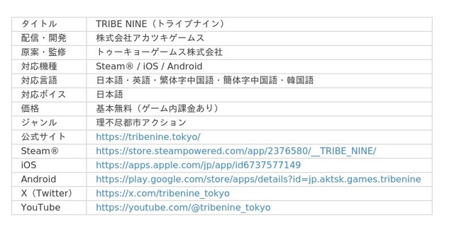 株式会社アカツキゲームス(本社:東京都品川区、代表取締役:戸塚 佑貴、株式会社アカツキ100%子会社)は、PC・スマートフォン向けで配信中の理不尽都市アクション『TRIBE NINE』(以下、『トライブナイン』)において、2025年4月18日(金)に最新アップデートVer1.1.0を実施したことをお知らせいたします。