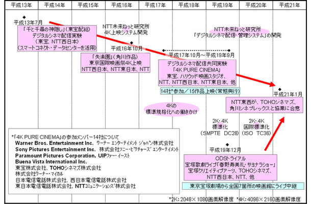 各国での製作や上映スクリーンのデジタル化が進展していることを受け、NTT東西と映画会社各社はあらたなサービスモデルの検討や技術検証を実施してきた。具体的には、東宝とNTT西日本によるデジタルシネマ実証実験、角川映画とNTT東西による世界初4Kデジタルシネマ上映、また東宝、TOHOシネマズ、NTT東西とハリウッド映画会社等とのデジタルシネマ配信共同実験「4K PURE CINEMA」などで、今回DCI仕様のデジタルシネマを高速光ファイバ網で配給から興行まで行うための協業に至ったと見られる。