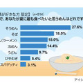「夏に食べたいめん類」は何なのか、最も食べたいものでは、1位は「そうめん」で27.6%。続く2位は「そば」18.5%、3位「ラーメン」15.0%という結果に。以降、「冷めん」は14.4%だったが、「うどん」(9.7%)「ひやむぎ」(5.4%)などは10%に満たなかった。