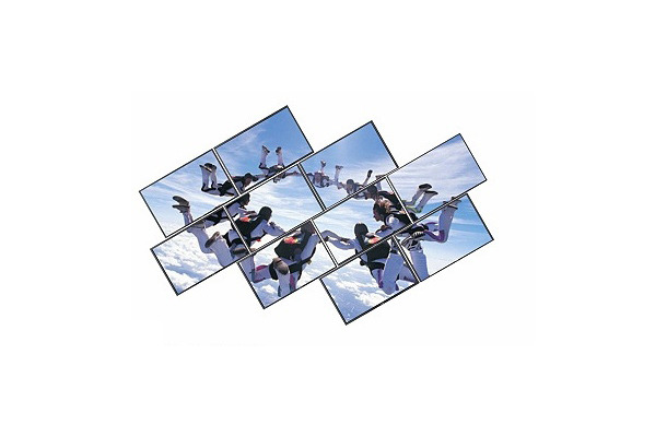 従来のビデオウォール型サイネージシステムは、同一ディスプレイを縦方向もしくは横方向に設置したレイアウトにしか対応していなかったが、「Ziris Canvas」では、サイズや画素数が異なるディスプレイを組み合わせ、角度や配置を自由にレイアウトすることが可能。縦横はもちろん、斜めに設置したディスプレイに対してもディスプレイの角度に応じて再生画像をリアルタイムに調整しながら表示できる。