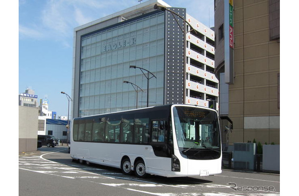 同大学では、環境省からの委託事業として、神奈川県の指導を受け、社団法人神奈川県バス協会、いすゞ自動車、東芝、ブリヂストン等の協力により、電動低床フルフラットバスの開発を続けてきた。今年3月17日に車検を取得し、4月20日に公開していた。今回試乗会に供されたのはこの車両だ。