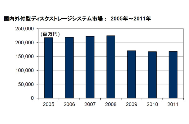 2011年は東日本大震災や電力不足、世界経済の減速などの多くのマイナス要因があったが、国内外付型ディスクストレージシステム市場は、2008年以来3年振りのプラス成長となった。要因としては、SAN(Storage Area Network)とNAS(Network Attached Storage)で構成されたオープンネットワークストレージに対する国内企業の支出が増加したためとIDC Japanでは分析している。
