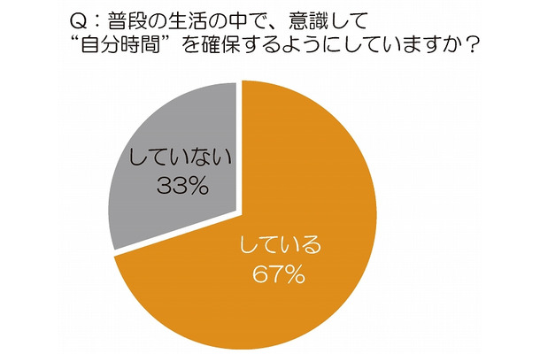 この調査は、50代男性経営者・役員100名にアンケートを行ったもので、調査期間は2月12日~2月14日。まず、「1日の生活のなかで、“自分時間”はありますか?」という質問に、72%が「毎日ある」、27%が「毎日ではないがある」と回答。また、「ふだんの生活のなかで、意識して“自分時間”を確保するようにしていますか?」という質問には、67%と約7割が「している」と回答した。