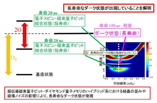 今回の発見は、「超伝導磁束量子ビット」と「ダイヤモンド量子メモリ」を組み合わせたハイブリッド系において、「長寿命のダーク状態」の発現するメカニズムを世界で初めて解明。保持時間の長い量子メモリを構成する新しいアプローチとして応用できるものとなる。なお、「ダーク状態」とは、量子力学的干渉性のためにその系から発する信号が打ち消されてしまい、実験的に検出のできない「隠れた状態」を意味する。ダーク状態は、一般に長寿命だが、実験的に検出ができないため、量子情報への活用は難しいと考えられていた。
