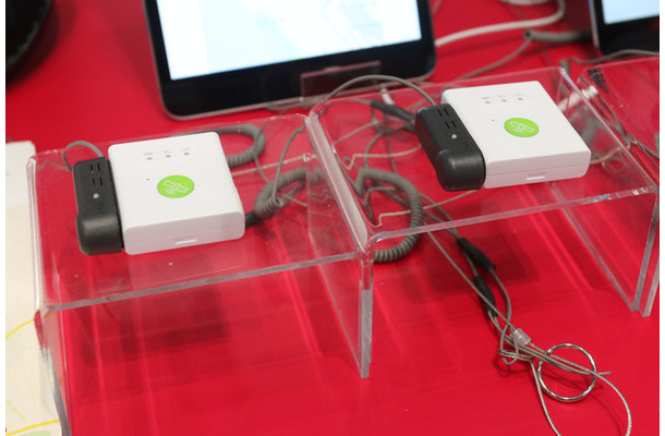 今回の展示では、高齢者の徘徊対策を想定したサービス例として、小型タイプの端末を靴底に設置したものが展示されていた。小型及び防犯ブザータイプはともにIPX5の防水仕様。