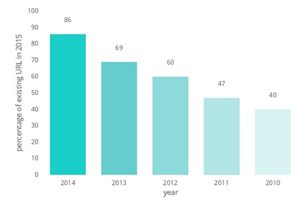 それによると、URLは経年で消滅しており、5年前(2010年)のURLは60%がなくなっていた。府省別でみると、内閣官房(75%)がもっとも残っており、外務省(61%)、環境省(57%)が続く。一方で、財務省のサイトURLは9%しか残っていなかった。