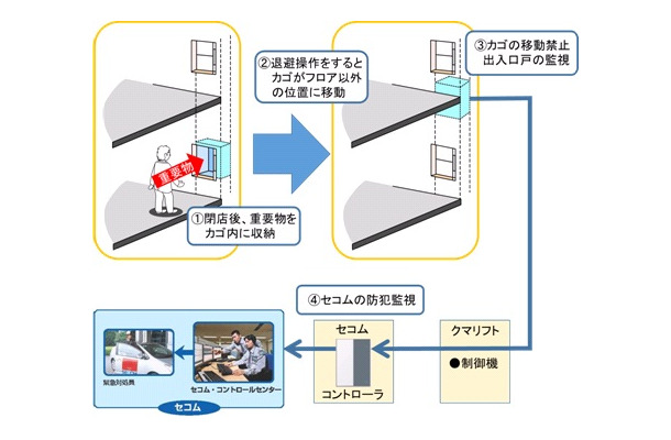 売上金などの重要物を小荷物専用昇降機に収納し、暗証番号を介した操作で外部からはアクセスできない場所に昇降機のかごを移動。さらにセコムのセキュリティ監視下に置くことで、かごの不審な移動や出入り口に異変があった場合には適切な対処を行う。