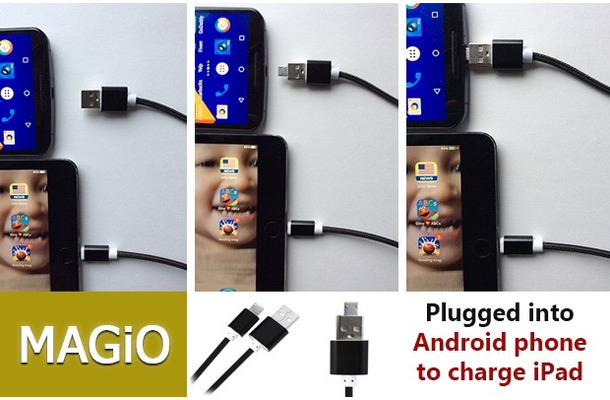 クラウドファンディングIndiegogoに登場した「MAGIO」は、一方の端子にUSBを、もう一方の端子に可変なMicro USB/Lightning端子を持つ。結果、以下の動画のように、1つの端子でiPhoneとAndroid端末の双方に接続でき、複数のケーブルを持ち歩く必要はなくなる。