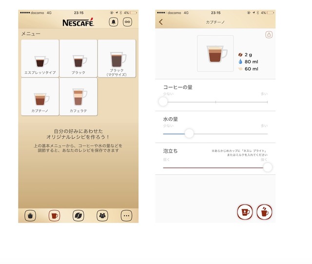 アプリを開くと早速「オリジナルレシピを楽しむ」という項目が目に留まる。画面から選べる基本メニューは、マシン本体と同じくブラックコーヒー、エスプレッソ・カプチーノ・カフェラテ・マグサイズのブラックコーヒーの5つ。選択すると、そのそれぞれのコーヒーの量、水の量、泡立ちがタッチで設定できる画面と、上に目安となるそれぞれの量が数字で現れる。コーヒーを自分好みでカスタマイズする場合は、ここで各項目を動かし量を調整。もちろん上の配分の数値もそれに応じて変わるが、芸が細かいのは上に出ている画像も変わること。水の量を多くしすぎたりすると、当然画像のカップもいっぱいいっぱいになってしまうので一定の目安として便利だ。