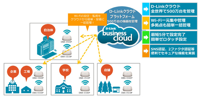 今回、ディーリンクジャパンが出展する製品やサービスの中でも、特に注目したいのがD-Link Business Cloudだ。これは同社のWi-Fiアクセスポイント「DBA-1510P」の設定、監視をクラウド上から行うというもの。複数台、複数拠点にわたるAPを一元管理できるので、導入や運用における管理者の負担を軽減できる。