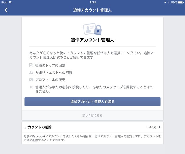 そのため、Facebookでは、遺族や後見人などしかるべき立場の人からの申し出によって特定のアカウントを削除したり、「追悼アカウント」に移行させたりする方法を用意している。