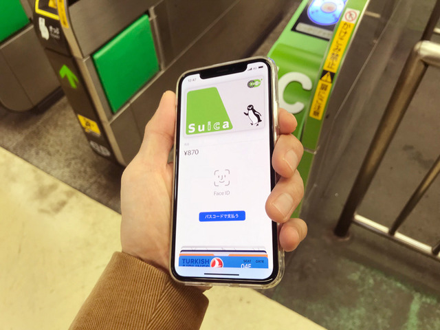 iPhone Xの場合は右サイドの電源ボタンを素速く2度クリックするとWalletアプリが立ち上がり、顔を近づけていれば素速くロックが解除されて改札にかざすことができる。Face IDの認識が素速く正確なのであまりエラーになることは少ないと思うが、顔を読み取れなかった場合は同じアプリ上でパスコードを入力して支払うこともできる。
