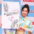 同商品のCMキャラクターを務める土屋は、浴衣姿で登場すると「みなさんに素敵な涼みを感じていただきたいなと思って、夏らしく涼しげな柄を選びました」とにっこり。
