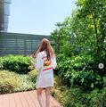 めるるは、着用したTシャツワンピについて、「コラボT~早速昨日私服で着た ゆるっとサイズで作ったから一枚でワンピっぽくも着れるしデニムとかで合わせても可愛い~」としたうえで、2つの投稿に分けて、前後からの着用画像を公開。股下丈で、めるるの美脚が際立っている。