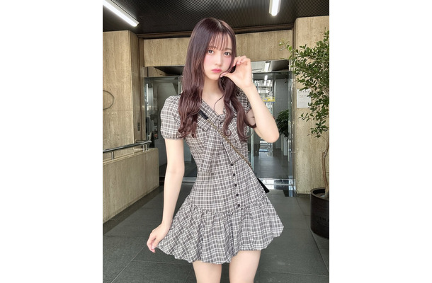 袖口と裾がふんわり広がるバルーンシルエットのチェック柄ワンピースをまとい、スカートの端を軽くつまんで笑顔を見せる“あざと可愛い”ショットや、美脚を際立たせた全身カットなど計3枚を投稿。愛らしさとスタイルの良さが際立つ姿に注目が集まった。