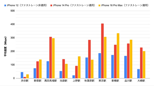 また、すべての駅で常にファストレーンが最速とは限らない。渋谷では非適用端末のほうが速い結果となり、秋葉原でも端末によって逆転が見られた。場所によっては、ファストレーンの効用が表れにくいケースもあるのだろう。
