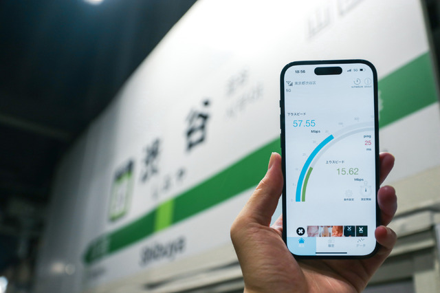後日、JR渋谷駅でファストレーン適用端末の下り速度を計測したところ、結果は57.55Mbpsだった。この速度でストレスなく動画を視聴するのは難しい【撮影/平木昌宏】