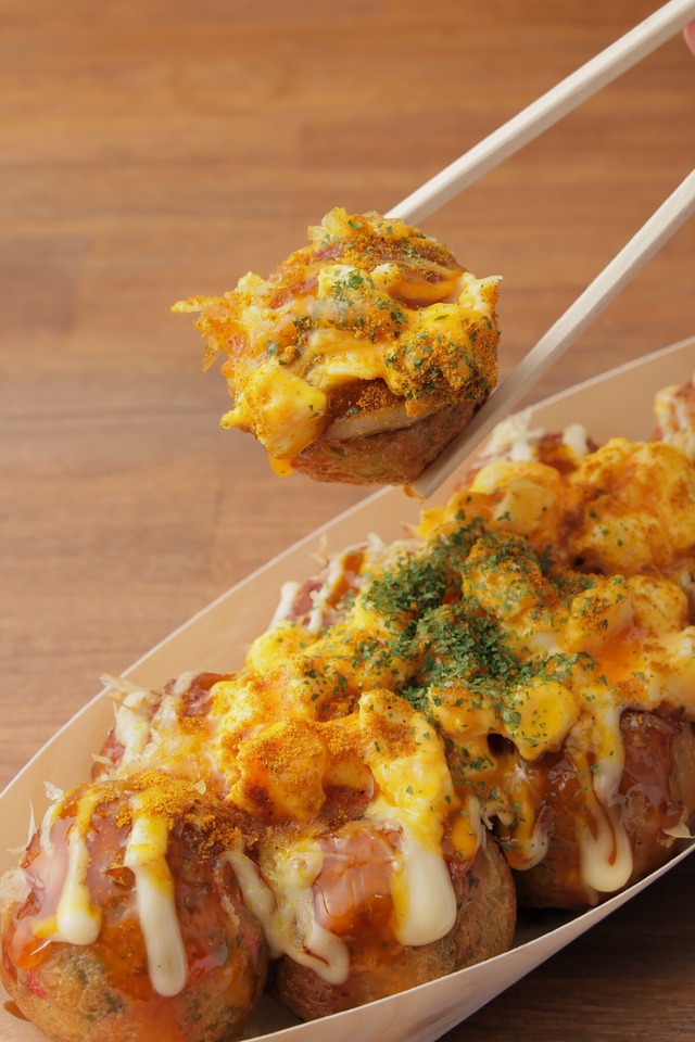 アツアツのたこ焼に特製「てりやきソース」をかけ、コク深いパルメザンチーズととろけるモッツァレラチーズの2種を組み合わせた特製「ミックスチーズ」と店内仕込みの「たまごサラダ」をトッピング。さらに濃厚な「卵黄ソース」を追いがけし、仕上げにカレーパウダーをふりかけることで香り高くコク深い商品に仕上げた。