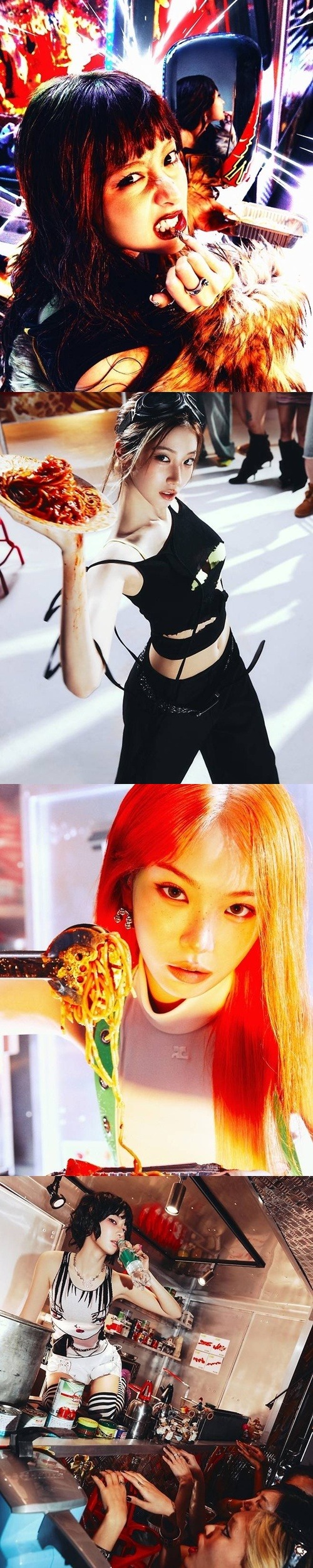 キム・チェウォンは自信に満ちたまなざしでスパゲティの麺を持ち上げるポーズをとり、オレンジ色の髪とそばかすメイクが印象的だ。宮脇咲良は食べ物を渇望する群衆とは対照的に、無表情で飲み物を口にし、ショートカットとシックな雰囲気で新たな魅力を漂わせる。ホ・ユンジンは食事の後に唇を指でなぞる仕草だけで圧倒的な存在感を放つ。カズハはランウェイを思わせるウォーキングで料理をサーブし、ホン・ウンチェは食材が積まれたフードトラックの中で輝くビジュアルとクールなオーラを披露している。