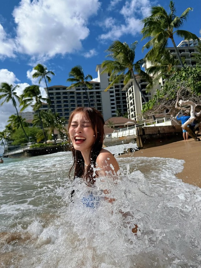 公開された写真には、青と白の爽やかな花柄バンドゥビキニをまとった内田の姿が収められている。ヤシの木と青空が広がるハワイのビーチで、波しぶきを浴びながら、くしゃっとした満面の笑みで大はしゃぎする無邪気なカットや、両手を広げて開放感を全身で楽しむ姿を披露。また、砂浜に立ってクールな眼差しをカメラに向けたり、髪をかきあげたりする大人っぽい表情のショットも公開した。
