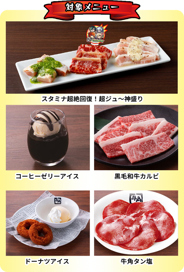同キャンペーンでは限定メニュー「スタミナ超絶回復!超ジュ~神盛り」が販売される。チキンバジル、希少な牛角上カルビ、ブラックガーリックピートロを盛り合わせたボリューム満点の内容で、牛角公式アプリ会員限定で注文できる。オリジナルピック2種のうち1種がランダムで付属し、注文1品につきオリジナルレンチキュラーキャラメッセージカード1枚がもらえる。