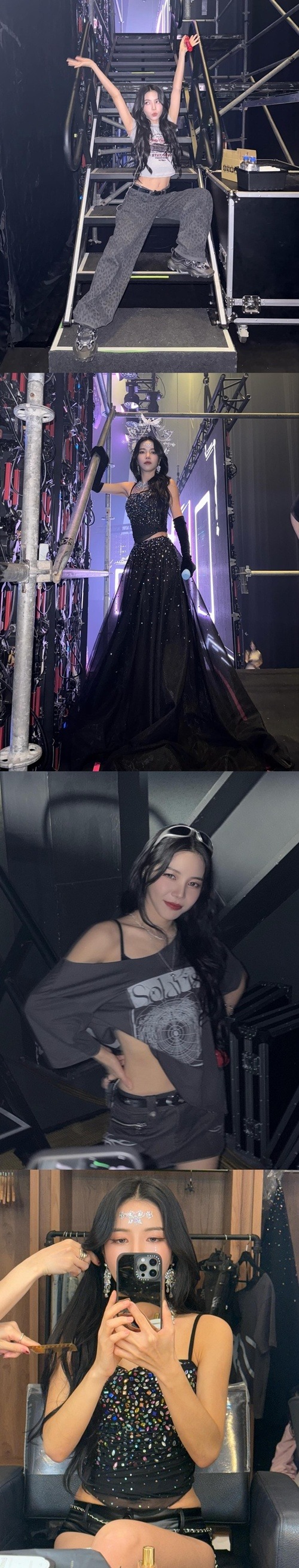 さらに別の写真では、銀色の王冠と華やかな装飾が際立つブラックのロングドレス姿で、優雅な女神のようなビジュアルを見せた。レーシングスーツをイメージした衣装にビーズを組み合わせた独創的なヘアスタイルも披露し、多彩な魅力をアピールした。