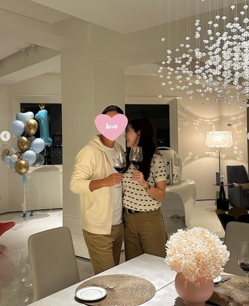 夫の正面の顔はハートの絵文字で隠されているが、向き合ってグラスを合わせる瞬間の横顔は公開された。