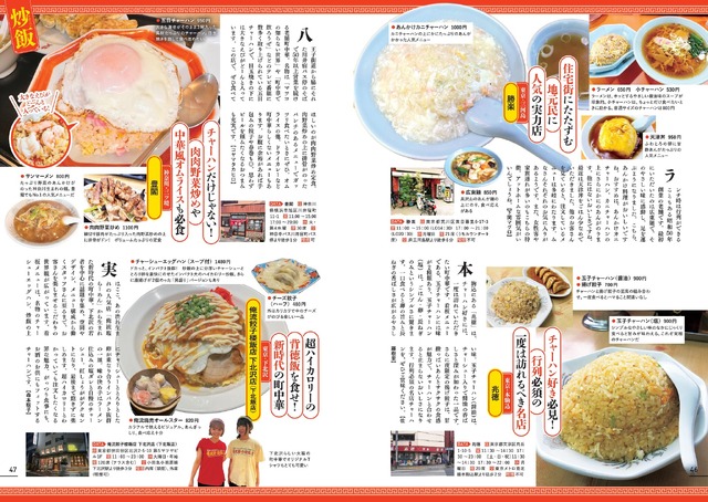 【餃子】ではジャンボ餃子が名物「一圓(上石神井)」、昼も夜も楽しめる「青葉餃子(神奈川・青葉台)」などを掲載。【炒飯】では名古屋伝統の皿台湾が味わえる「玉川屋酒店(蒲田)」、新製法チャーシューで進化を続ける「一寸亭(根津)」などを取り上げている。【丼もの&皿めし】では東京屈指の老舗町中華「あさひ(浅草)」、あえてのオムライス「中華料理 一番(亀有)」などを紹介。【定食・その他】では卵使いの達人「中華屋啓ちゃん(荻窪)」、映画化もされた名店「中華風家庭料理ふーみん(南青山)」などを掲載している。