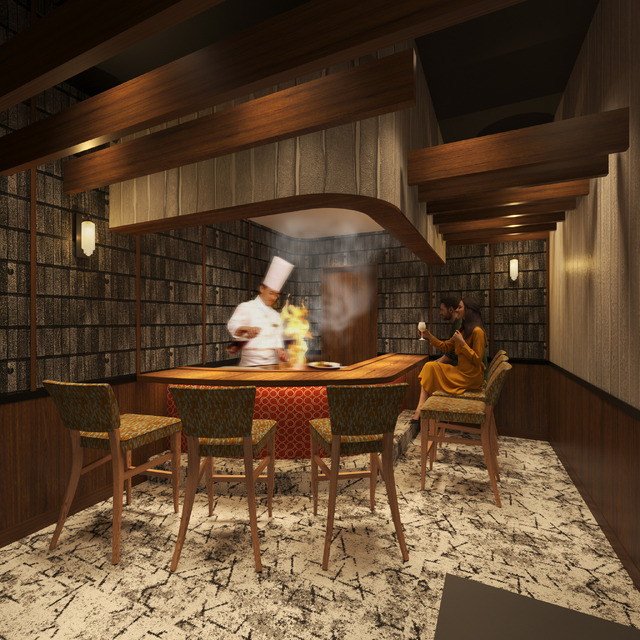 ライブ感あふれるカウンターでは、熟練のシェフが目の前で焼き上げる臨場感とともに、こだわりの黒毛和牛を堪能できる。