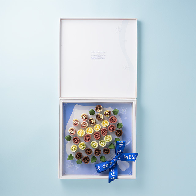 「レトル・イヴェール」は3326円で、封筒を模した薔薇のチョコレートボックスだ。華やかなイチゴマーブルとミルクの3段の薔薇をメインに、ピスタチオマーブル、ミルク、ミルクマーブル、ホワイト、抹茶の薔薇やリーフを詰めた。ブランドを象徴する薔薇の花びらを1枚1枚食べるような柔らかな口どけを楽しめる。