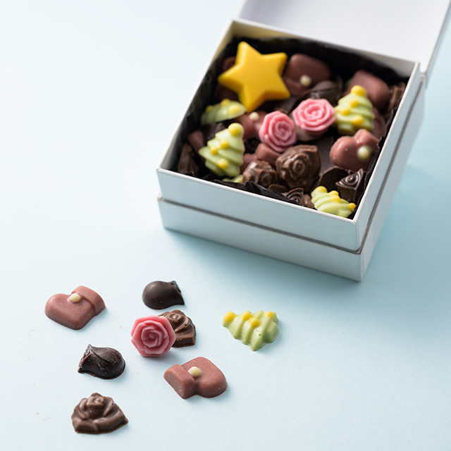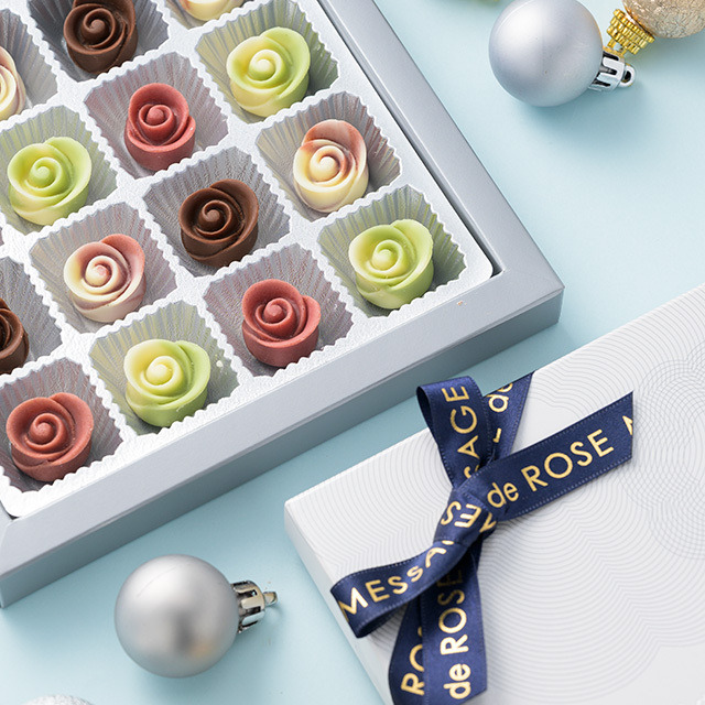 「ミニローズ・イヴェール」は1901円で、ジュエリーのような小箱に詰めたプチギフトだ。ミルクの小さな薔薇、ビターのつぼみ、レモンのスターとピーチのプチローズ、イチゴのくつした、ホワイトのツリーを飾り詰めている。様々な味を楽しめるクリスマス限定商品だ。