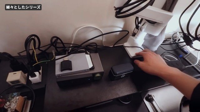 デスクツアーとして同環境を紹介しているのはガジェット系YouTuber・メルルーサ丸岡さん。丸岡さんは賃貸のクローゼットを作業場へと転用し、動画編集を想定したマルチデバイス環境を“狭さ前提”で組み上げていった。いわゆる賃貸によくあるクローゼットの中棚を天板として使い、その上に4台の端末(iPad Pro、iPad mini、MacBook Pro、ミニPC)と4Kモニターを並べた濃密な作業スペースを作り上げた。