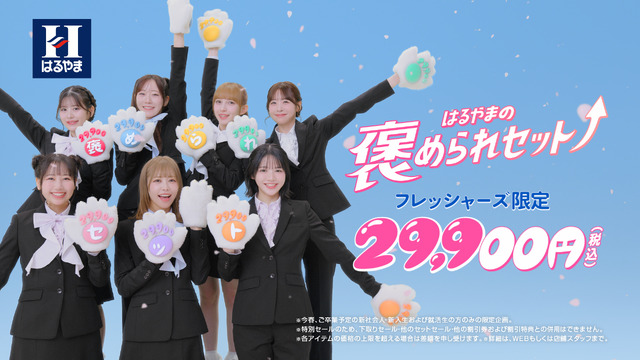 放映開始に合わせ、はるやま商事は2026年4月に入学式や入社を迎えるフレッシャーズに向け、「はるやま褒められセット」を29,900円(税込)で発売する。メンズスーツ、レディススーツともに、頭から足まで“褒められ仕様”のアイテムが揃うお得なセットとなっている。