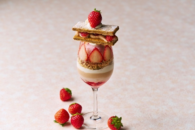 カフェメニューからは、「陰影」をコンセプトにした2種の苺のパフェが登場する。白と黒のコントラストを取り入れ、見た目にも印象的な一品に仕上げている。
