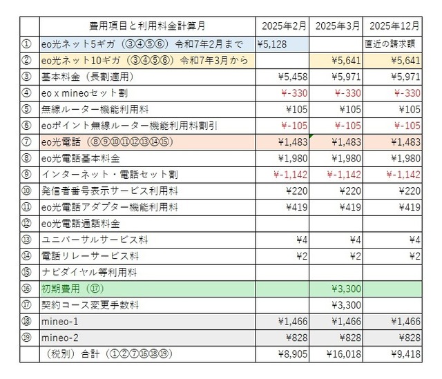 移行前の月額請求額(eo光電話、mineo2回線を含む)は8,905円で、移行後の直近の請求額は9,418円と、増加分は513円にとどまっている。なお、Sさんのケースではコース移行に伴う工事は不要で、初期費用として契約コース変更手数料3,300円が発生した。