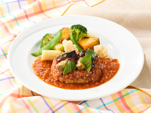 改定ポイントの1つ目は、ハンバーグを主役にした食べ応え重視の新メニューだ。ハンバーグに目玉焼き、海老フライ、カニクリームコロッケ、さらに新登場の「本気の唐揚げ」まで盛り合わせた「満腹!オールスタープレート」(税込1,309円)を用意するほか、ガーリックを効かせたトマトソースに揚げなすとフレッシュバジルを合わせた「揚げなすとバジルのガーリックトマトハンバーグ」(税込1,045円)も登場する。