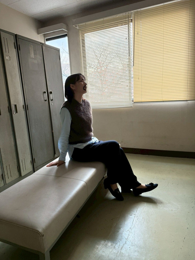 一方で顔には、太い眉に口ひげ、あごひげまで描き込んだ“変なおじさん”風のフェイスペイント。クールな表情とコミカルなビジュアルのギャップが強烈で、廊下を歩く“颯爽”とした姿や、ベンチに腰掛けて物憂げな雰囲気を漂わせるカット、思わず笑みがこぼれたようなショットなど、遊び心あふれるオフショットが並んでいる。