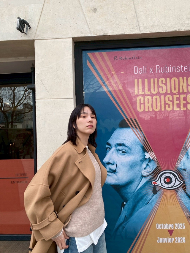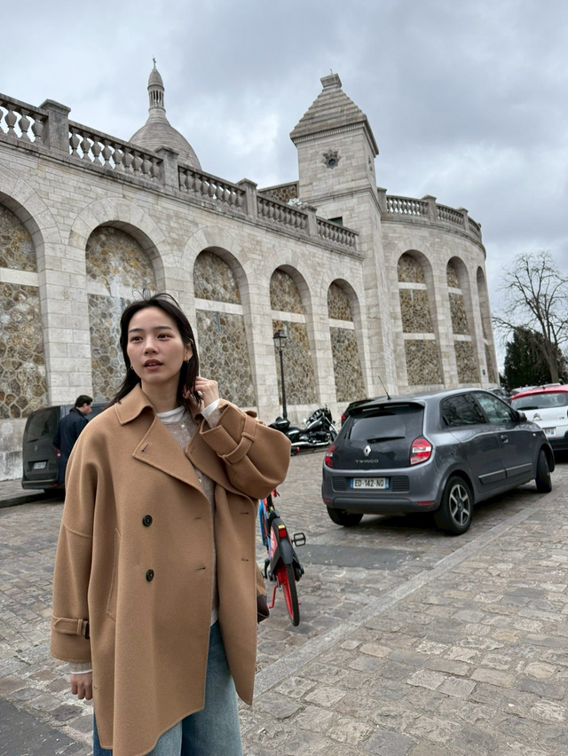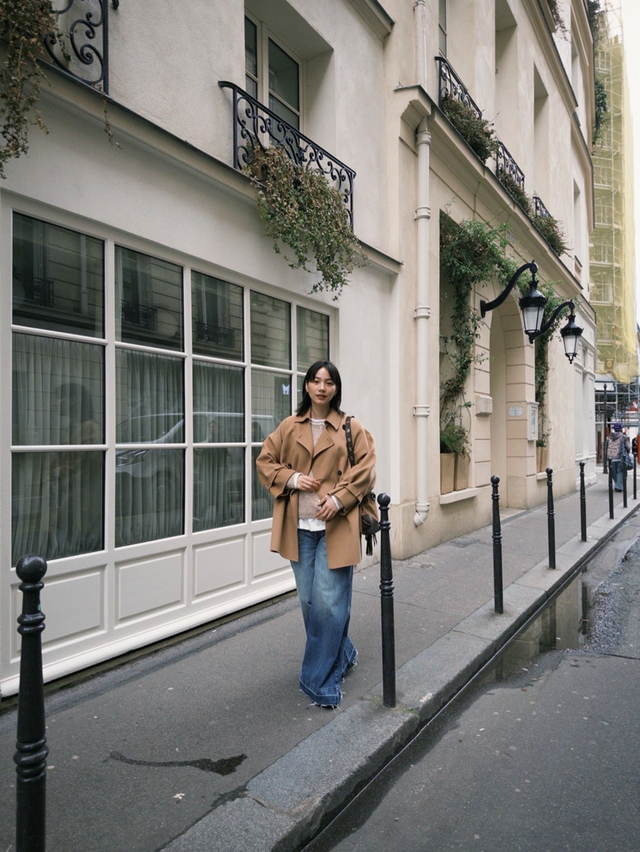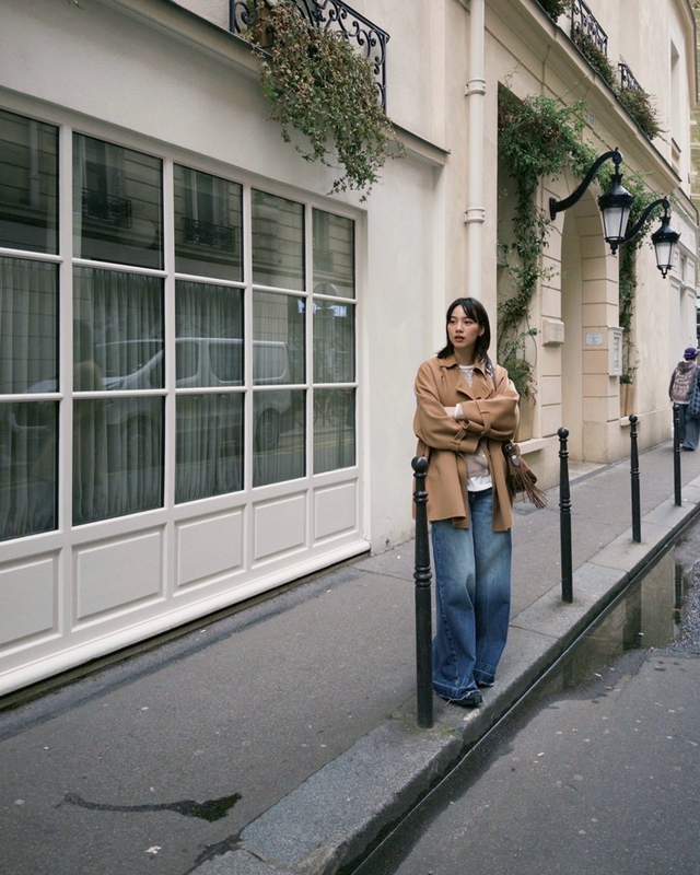 淡いベージュのカーディガンに白シャツを合わせ、ゆったりとしたベージュのオーバーサイズコートにデニムを合わせたシンプルながら洗練されたコーディネートで、石畳の街並みやクラシカルな建物を背景に佇む姿や、窓辺から街を見下ろす横顔ショット、街角を歩く姿など、まるで映画のワンシーンのような雰囲気漂う写真を複数枚公開した。