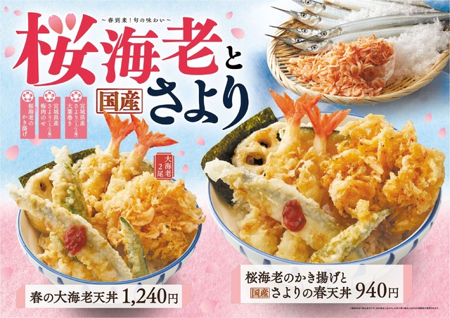 天丼・天ぷら本舗 さん天が、4月16日から5月13日まで「桜海老と国産さよりフェア」を開催する。フェアでは、桜海老のかき揚げや国産さよりを使った天丼、天ぷら定食、盛り合わせ、そば・うどんなどを展開する。